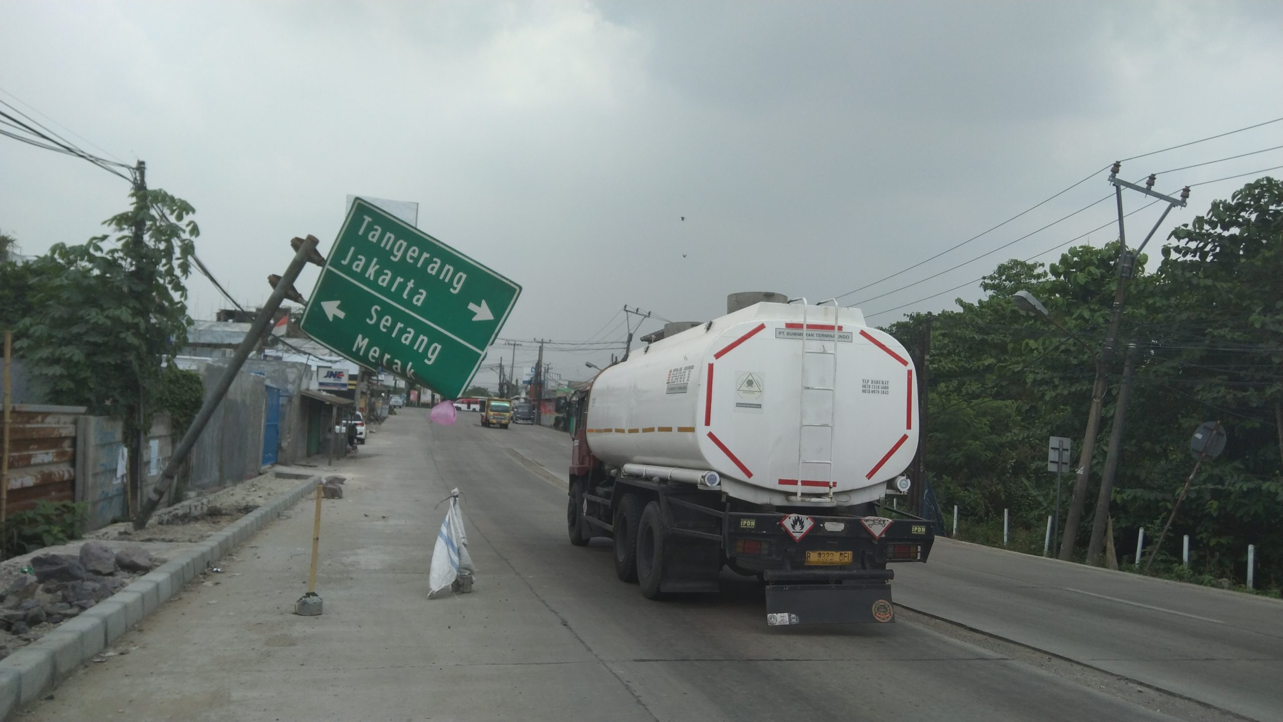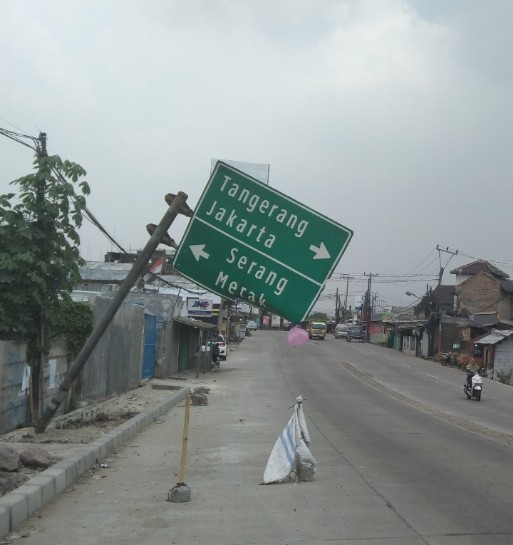 SERANG ~PNews~ Papan penunjuk arah jalan miring hampir jatuh di ruas jalan provinsi, tepatnya di pertigaan Asem Desa Cikande, Kecamatan Cikande  Kabupaten Serang.