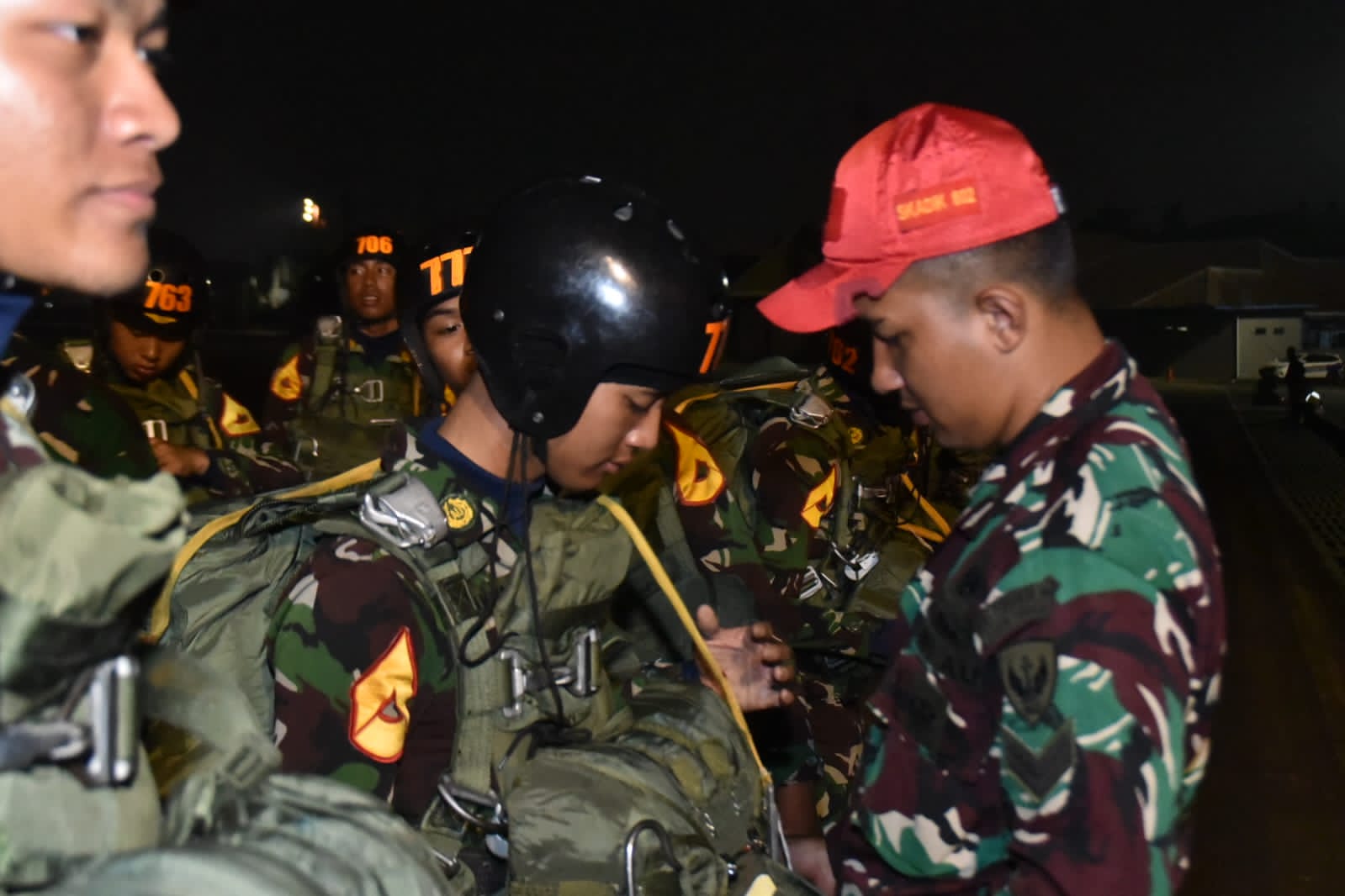 Latihan terjun payung didukung pesawat C-130 H A 1315 dari Skadron 32 Wing Udara 2 lanud Abdulrahman Saleh Malang dengan Pilot Mayor Pnb Gintoro. Pelaksanaan terjun malam dilaksanakan sebanyak 3 sorty dan 16 run berjalan aman dan lancar.