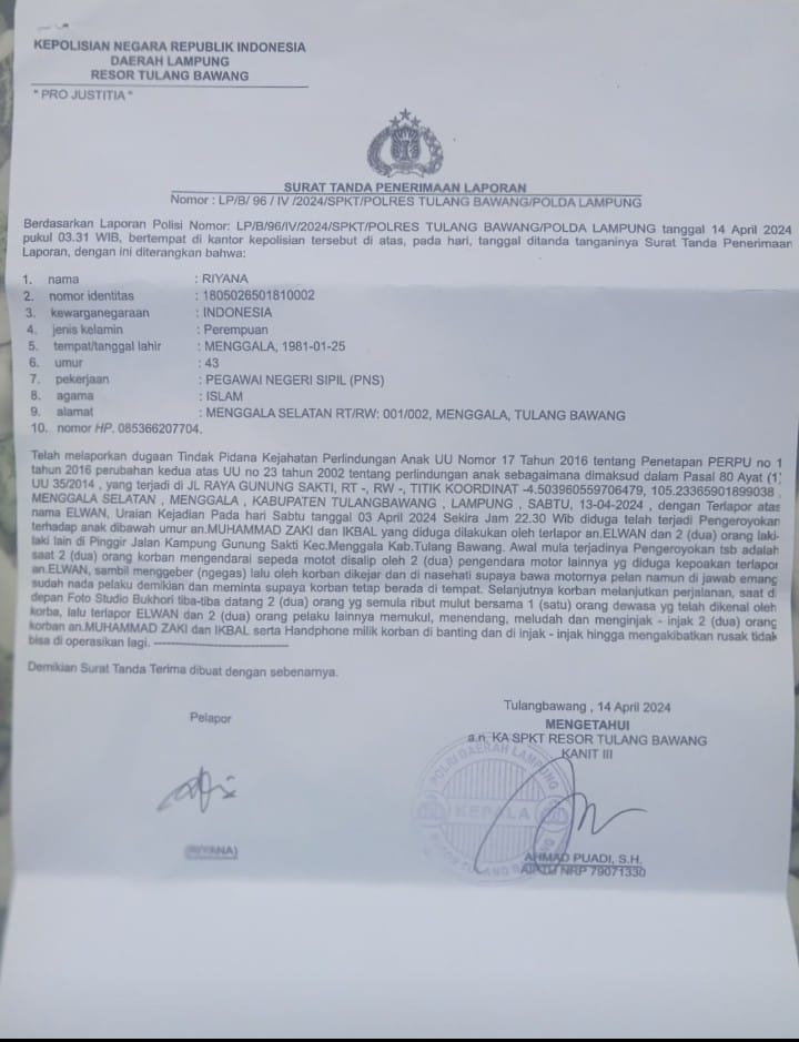 Akp Indik Rusmono, S.I.K., M.H., mengatakan,” bahwa petugas Satreskirm unit PPA Polres Tulang Bawang telah menerima laporan dan telah menindak-lanjuti laporan yang kami terima dengan nomor bukti laporan Polisi : LP/B/90/V/2024/SPKTI Polres Tulang Bawang Polda Lampung di tanggal 14 April 2024 pelapor A.N Riyana yang dilaporkan yaitu penganiayaan atau kekerasan terhadap anak, korban anak Sdra MZ usia 14th.