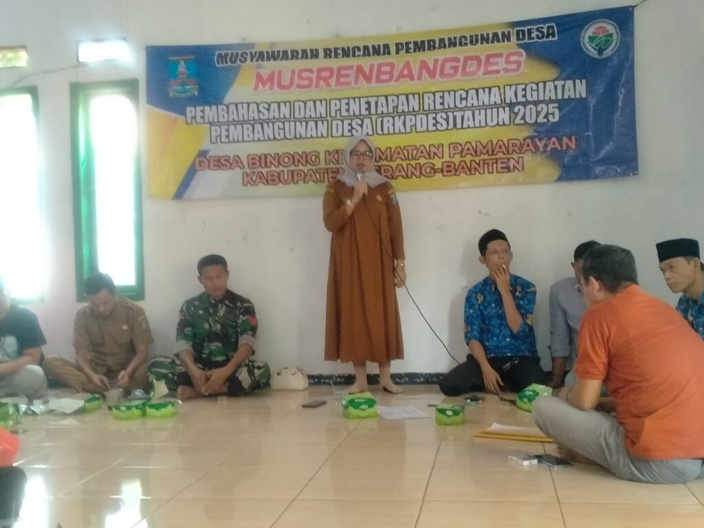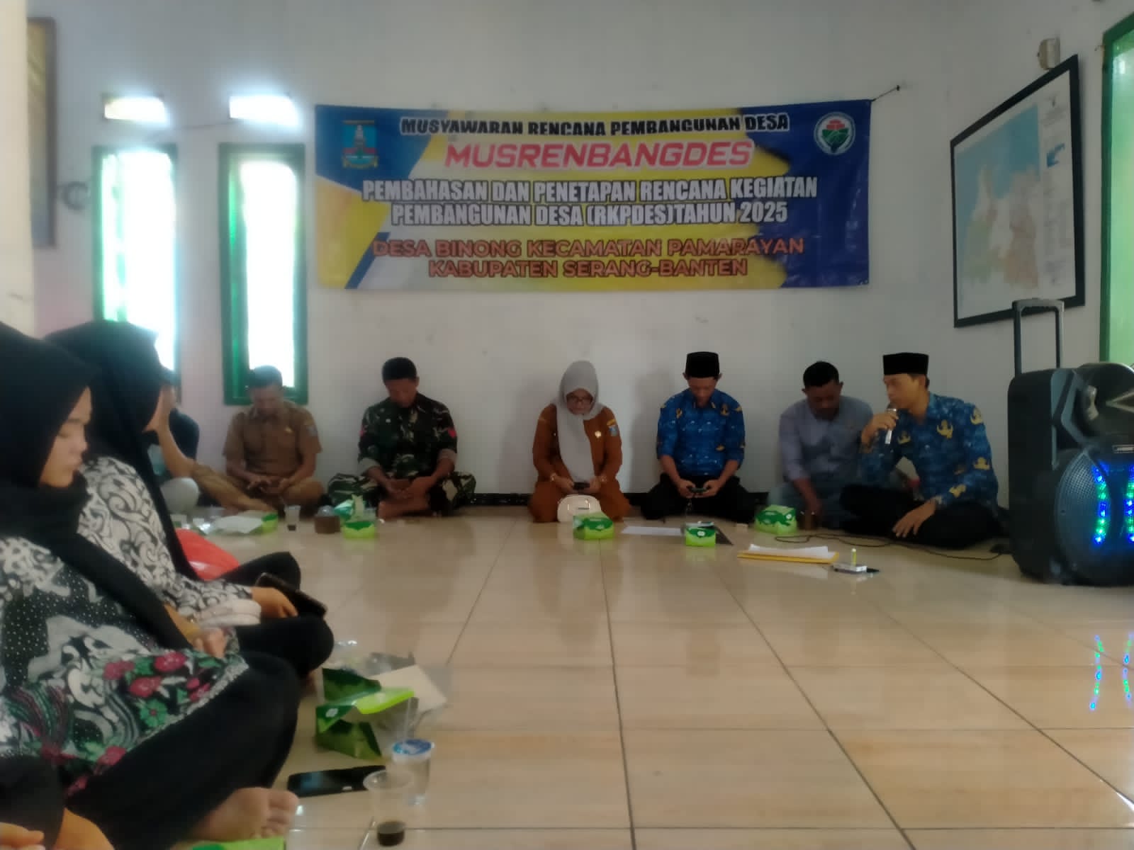 Bertempat di Kantor Desa Binong, acara dibuka oleh ketua BPD dan dihadiri Lembaga Desa, Porkapimcam, PLD Desa, Karang Taruna, tokoh masyarakat, ketua RT, RW dan kader Desa, menyampaikan daftar usulan RKP Desa Tahun 2025, yang resmi ditetapkan dan 6 usulan di antaranya: 1. Pagar Sekolah Dasar Asam, 2 Jalan Lingkungan Kampung Pabuaran Mangir sepanjang 2 Km. 3. Sanitasi, 4. Saluran air jalan harendong Pamarayan, dan 5 Rutilahu, yang akan dibawa pada forum musrenbangcam telah disepakati.