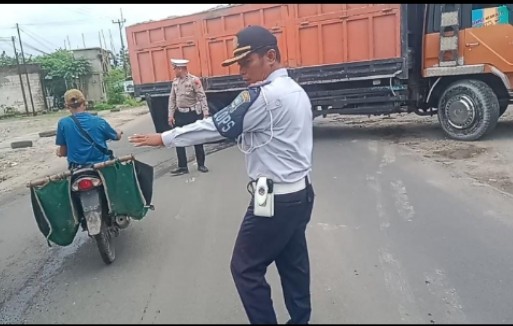 SERANG -PNews– Petugas Pospam Jawilan yang berada di Jalan raya Rangkasbitung Cikande Desa Cemplang Kecamatan Jawilan Kabupaten Serang, memutar balik truk muatan pasir, Kamis (26/12/2024).