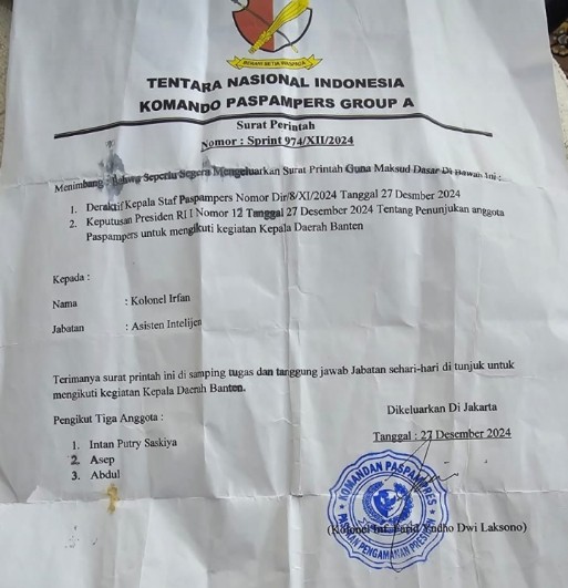 “Kemudian pada tanggal 19 Januari 2025 1 lembar Surat Perintah Komando Paspampres Group A tersebut oleh Tsk LA di kirim melalui Whatsapp ke pada Sdr. AR agar percaya bahwa sudah ada surat dari Paspampres. Pada tanggal 28 Januari 2025 Sdr. FT mendapatkan pesan WA dari seseorang yang mengaku bahwa dirinya bernama Sdr. AR dan meminta tolong kepada Sdr. FT untuk bertemu dan bersilaturahmi dengan sdr. HR ataupun Kepala Daerah terpilih tahun 2024 yang merupakan kaka dari sdr. HR yang mana sdr. AP menjelaskan kepada Sdr. FT bahwa dia membawa utusan dari pusat yang ditugaskan ke daerah untuk mengamankan kepala daerah terpilih yang diusung 02, maka Sdr. FT menghubungi Sdr. HR dengan menyampaikan bahwa ada utusan pengamanan Kepala Daerah terpilih dari 02 ingin bertemu agar dapat di pertemukan dengan Kepala Daerah terpilih tahun 2024. Kemudian pada hari Kamis tanggal 30 Januari 2025 sekira jam 23.00 Wib dilakukan pertemuan di salah satu Pondok Pesantren di Kota Serang antara Sdr. HR, Sdr. FT, Sdr. MQ, Sdr. AR dan Tsk LA dalam pertemuan tersebut Sdr. AR memyampaikan bahwa Tsk LA di berikan tugas untuk mengamankan Kepala Daerah dari 02 yang terpilih, kemudian Sdr. HR menanyakan surat tugas dan Tsk LA menunjukan 1 lembar Surat Perintah Komando Paspampres Group A Nomor : Sprint 974/XII/2024, tanggal 27 Desember 2024 dengan mengatakan bahwa dirinya anggota Paspampres dari TNI Angkatan Udara, maka dari itu sdr. HR mengubungi Kepala Daerah terpilih tahun 2024 dan menyampaikan ada paspampres ingin bertemu, selanjutnya pada tanggal 02 Februari Tsk LA bertemu di kediaman Kepala Daerah terpilih tahun 2024, pada saat itu ada suaminya dan suaminya bertanya kepada Tsk LA kemudian ia menjawab bahwa dirinya adalah anggota Paspampres dari TNI AU di tugaskan untuk menjaga Kepala Daerah terpilih yang diusung 02 dan menunjukan 1 lembar Surat Perintah Komando Paspampres Group A, kemudian suami dari Kepala Daerah terpilih tahun 2024 memfoto Surat guna di pertanyakan kebenarannya kepada pihak Paspampres, selanjutnya suami dari Kepala Daerah terpilih tahun 2024 memberikan beberapa pertanyaan terkait dengan apa tugas pokok dan bagaimana cara menjaga Kepala Daerah, akan tetapi Tsk LA terlihat seperti mencurigakan dan jawabannya tidak sesuai. Selanjutnya pada tanggal 03 Februari 2025 suami dari Kepala Daerah terpilih tahun 2024 menyampaikan kepada Sdr. HR bahwa 1 lembar Surat Perintah Komando Paspampres Group A Nomor : Sprint 974/XII/2024, tanggal 27 Desember 2024 ialah surat palsu, dan Sdr. HR langsung melaporkan ke Polda Banten,” ungkap Dirreskrimum.
