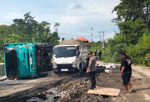 โSaat di TKP, kondisi jalan yang menikung, hingga truk terguling karena terdengar sempat bunyi dari bawah mobil hingga akhirnya terguling,โ jelasnya.