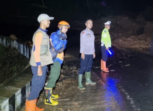 Majalengka -PNews- Personil Polsek Cikijing Polres Majalengka Polda Jabar bersama tim dari BPBD Kabupaten Majalengka dan juga warga mengevakuasi material longsor di jalan Nasional Cikijing-Kuningan tepatnya di Blok Cipadung, Desa Sindangpanji, Kecamatan Cikijing, Kabupaten Majalengka, Minggu (11/05/2025).