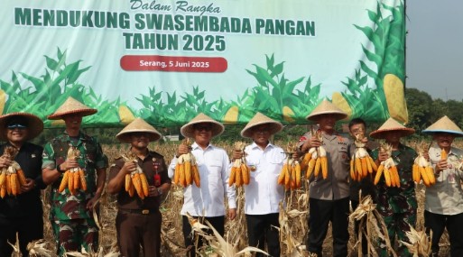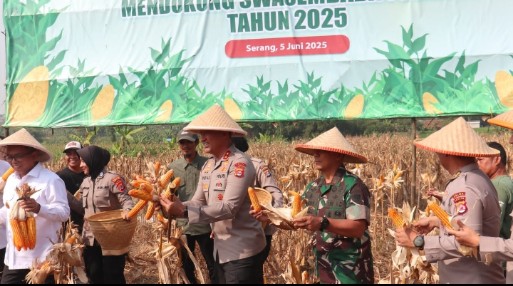 SERANG,  -PNews- Gubernur Banten Andra Soni bersama Kapolda Irjen Suyudi Ario Seto, Kapolres Serang AKBP Condro Sasongko melaksanakan panen raya jagung serentak kuartal II di Desa Cemplang, Kecamatan Jawilan, Kabupaten Serang, Kamis (5/6/2025).