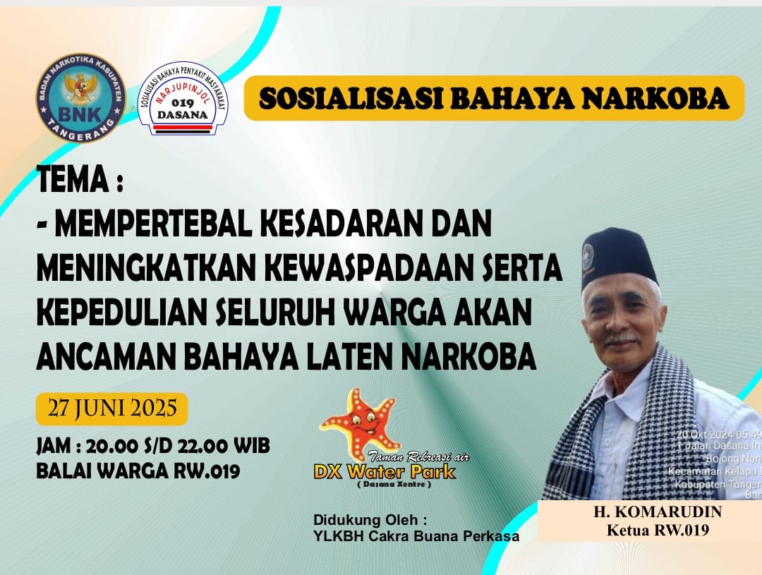 Perkasanusantara.com – Tangerang- Dengan mengusung thema “Mempertebal Kesadaran dan Meningkatkan Kewaspadaan Serta Kepedulian Seluruh Warga Akan Ancaman Bahaya Laten Narkoba”, pengurus lingkungan RW 019 Perumahan Dasana Indah Kelurahan Bojong Nangka, Kecamatan Kelapa Dua, Tangerang, pada hari Jum’at (27/6/ 2025) mengadakan Sosialisasi Bahaya Narkoba, dalam rangka turut mengisi rangkaian kegiatan Hari Anti Narkoba Internasional (HANI) yang diperingati setiap tanggal 26 Juni.