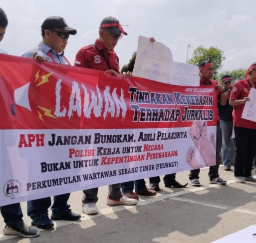Aksi solidaritas wartawan yang tergabung dalam Perkumpulan Wartawan Serang Timur (PERWAST), Kelompok Kerja Awak Media Jawilan (POKJA AMJ), Persatuan Wartawan Indonesia (PWI) Kabupaten Serang ini berlangsung di depan Mapolres Serang, Jum’at, 22 Agustus 2025.